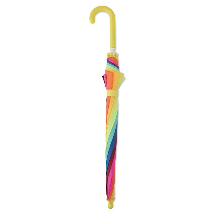 18 inch kids umbrella in 190T pongee with rainbow pattern. It has 8 panels. Manual opening and closure. Fibreglass ribs and frame. Plastic handle and tips. Curved handle.