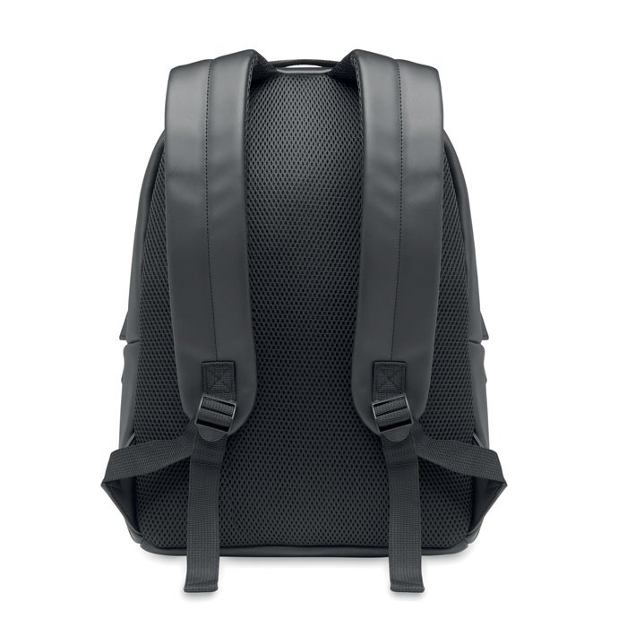 15 inch laptop backpack in soft PU with padded back and reinforced base. Front zipped pocket. The lining is 210D RPET.