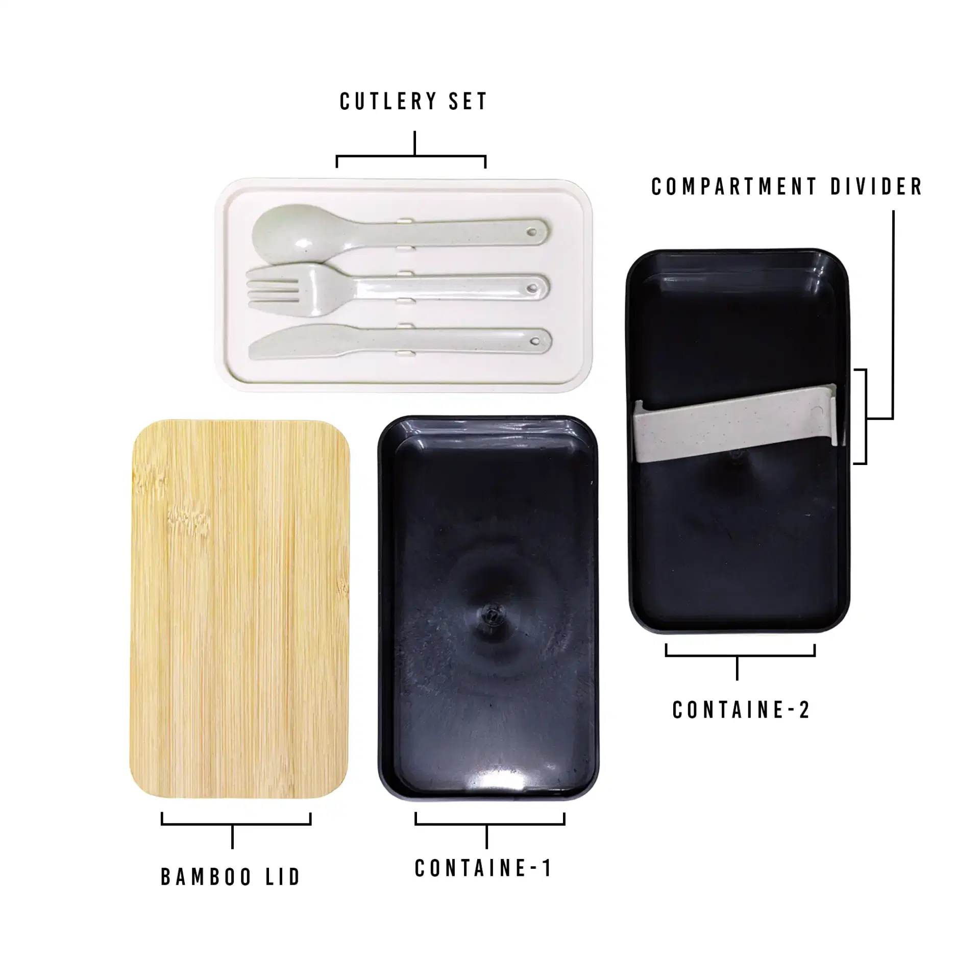 Durable wheat straw double lunchbox with bamboo lid, two compartments, and included cutlery. Portable, eco-friendly, and perfect for daily use.