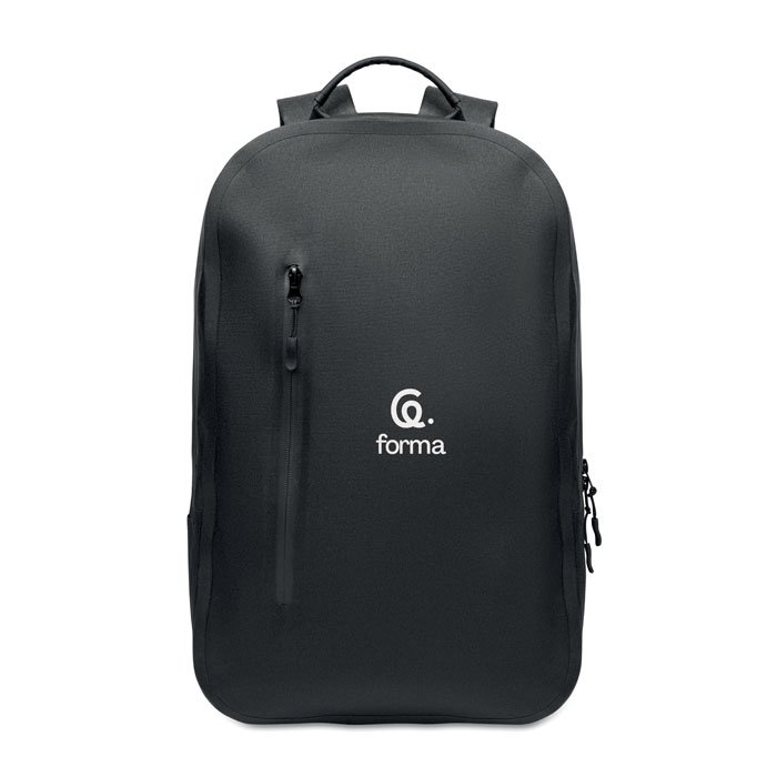 Laptop backpack 16” in 300D RPET polyester and 210D polyester lining. Water-resistant fabric. Hidden zippered pocket and trolley holder on the back. Padded internal laptop compartment, mesh back and shoulder strap.