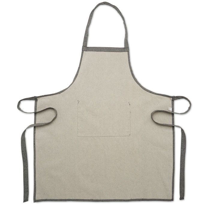 Adjustable kitchen apron with 1 front pocket in 220 gr/m? recycled cotton. 80% recycled cotton, 20% regular cotton.