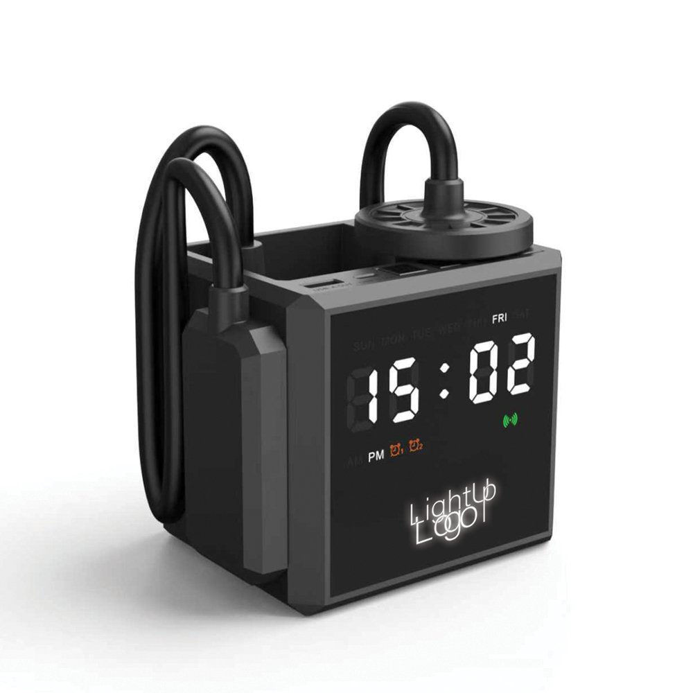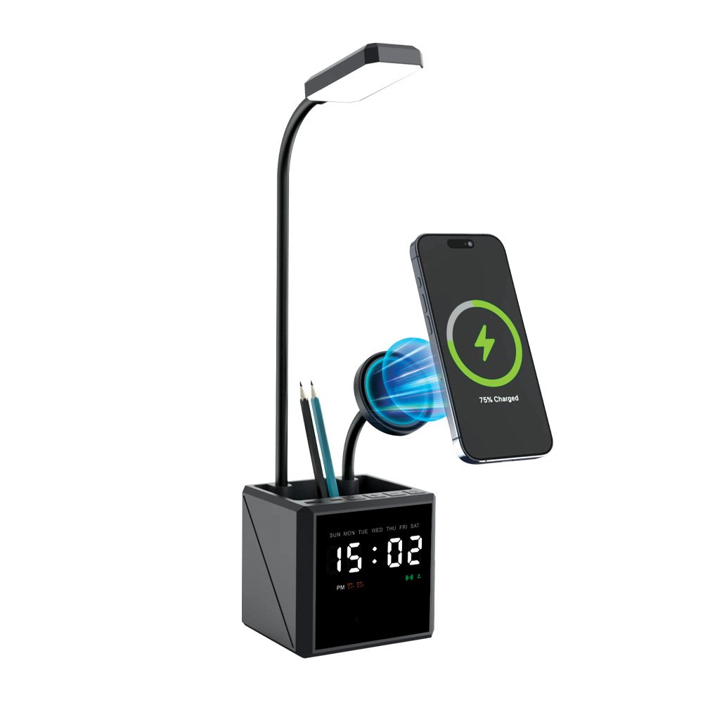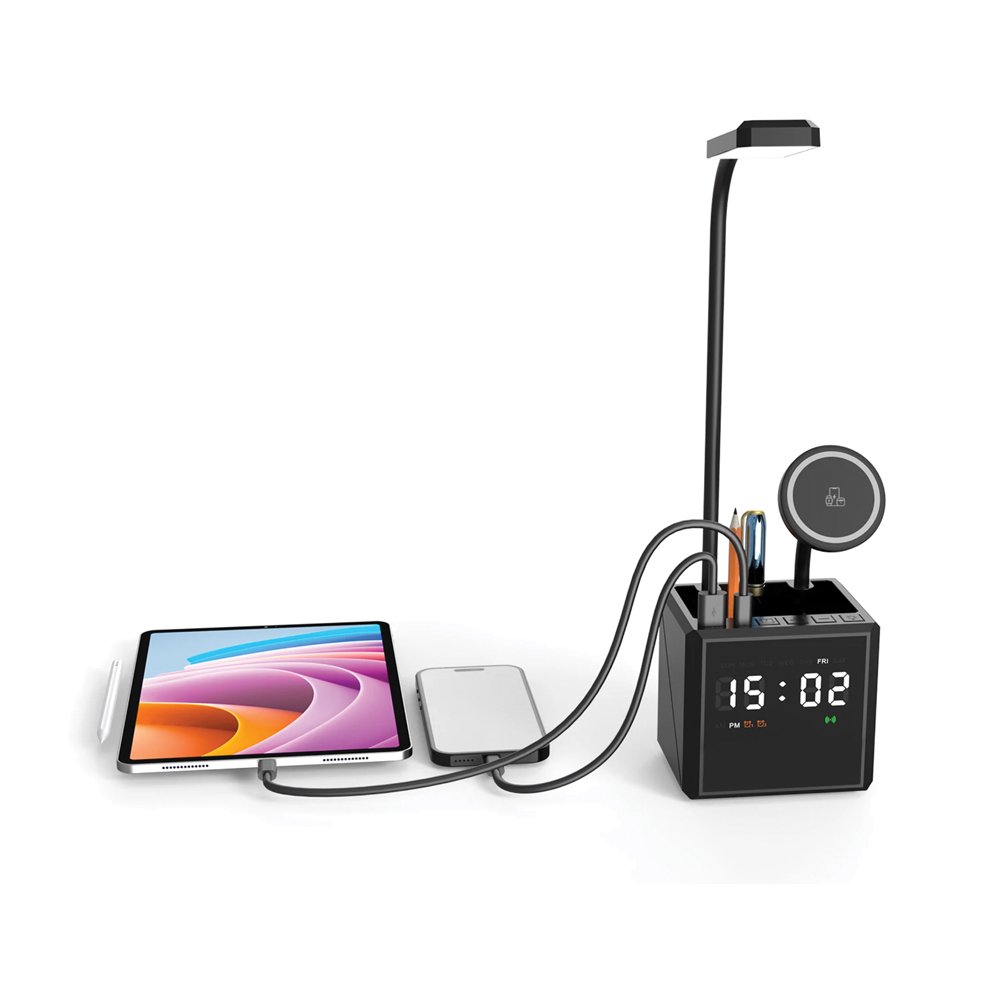 Keep your workspace organized and fully charged with our 4-in-1 Desk Dock. It features a MagSafe wireless charger for your phone, earphones, and watch, a digital display clock, a sleek lamp, and a handy pen holder.