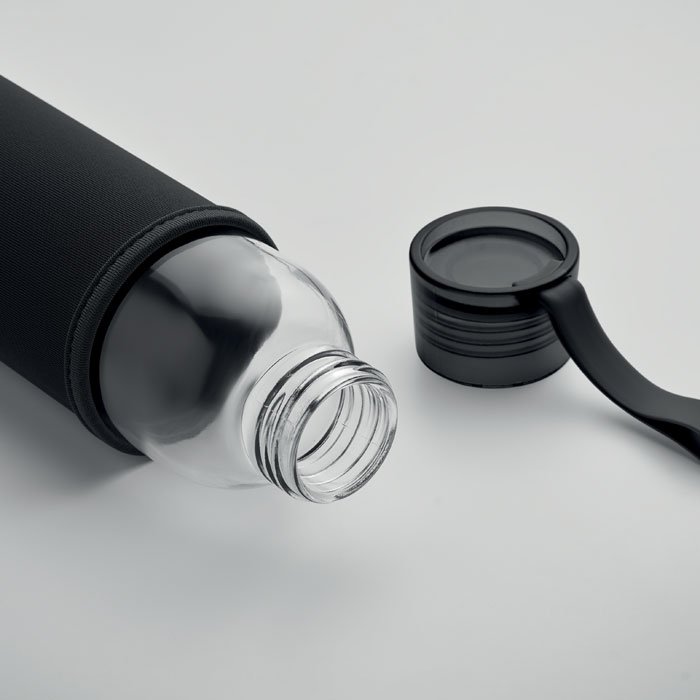 Recycled glass bottle with neoprene pouch and PP lid with silicone hanger. Leak free. Capacity: 500 ml.