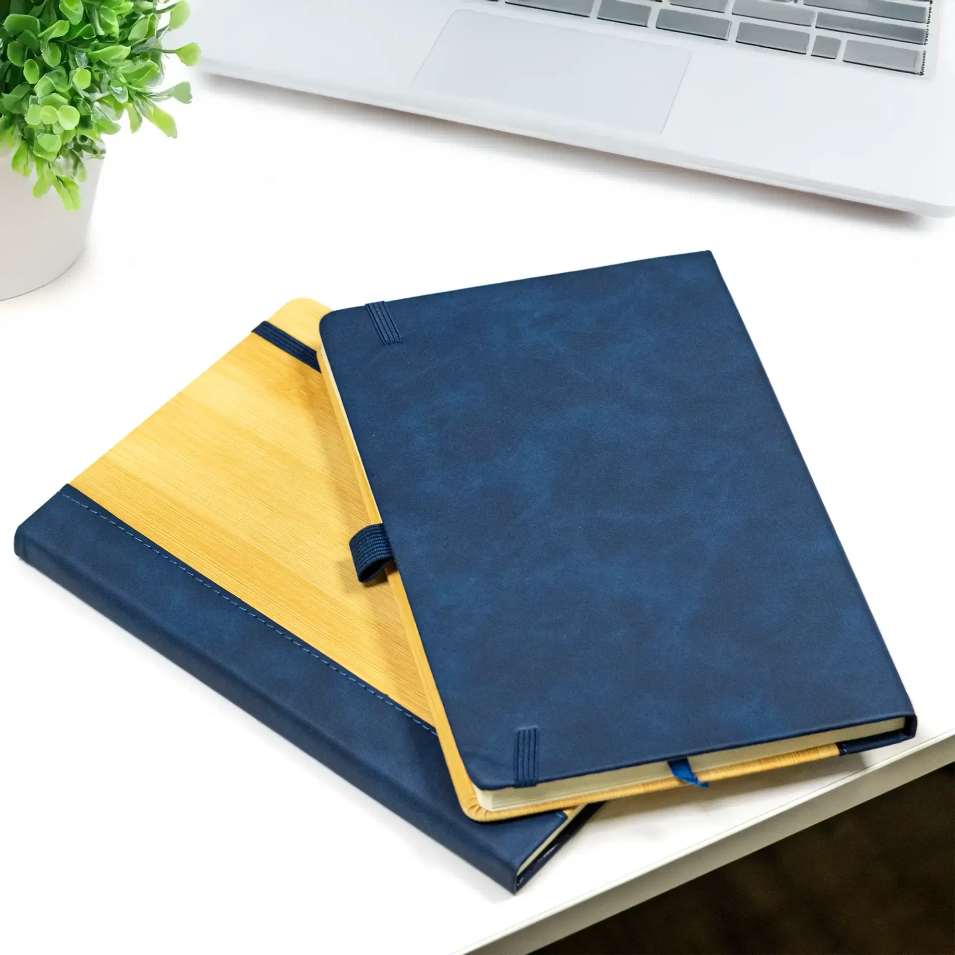 Elegant promotional notebook with Bamboo finish front and textured PU back. Features 96 ruled pages, elastic pen loop, and bookmark ribbon — perfect for eco-conscious corporate gifting.