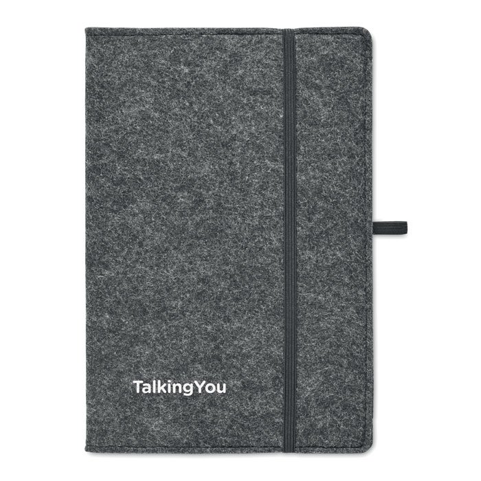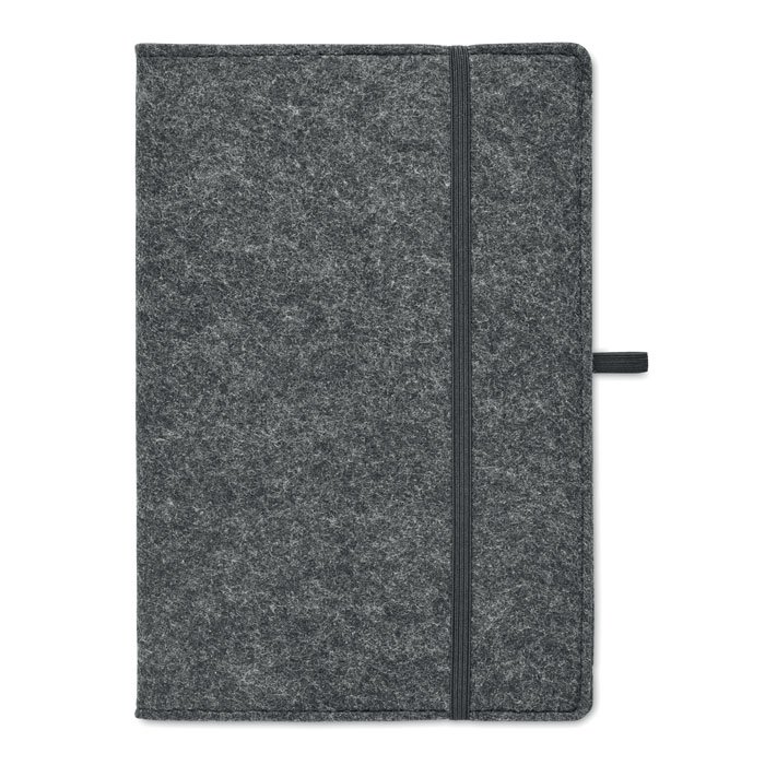 A5 notebook with RPET felt cover. 160 recycled paper lined pages (80 sheets / 70 gr/m?). Elasticated pen loop.