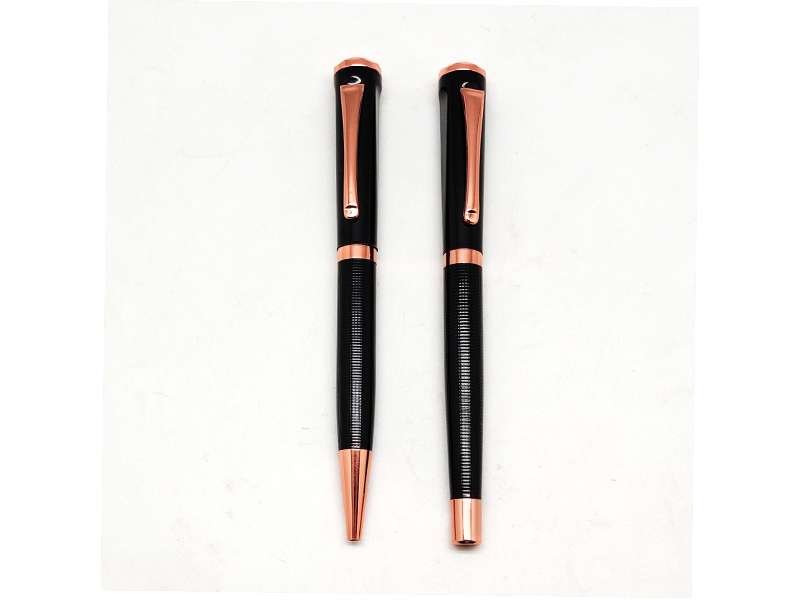 Galaxy, A pen set consisting of a roller pen with a matching ball pen. this set comes in an elegant Black with Copper color. The ideal companion for board room meetings and is very pleasing to the eye.