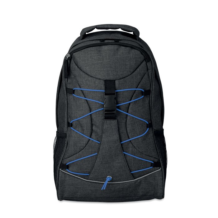 Backpack in 600D 2 tone polyester with colourful contrasting facing and glow in the dark cord on the front panel. Mesh pockets on both sides.