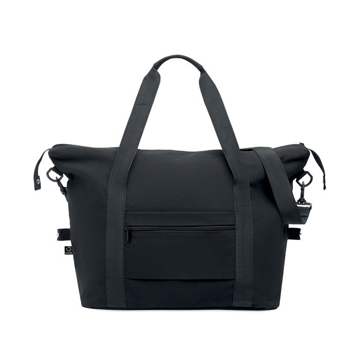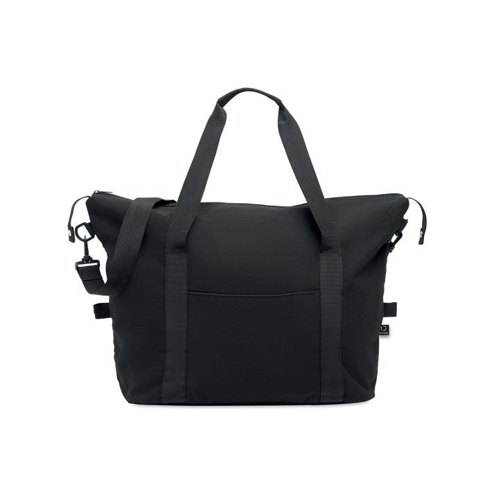 Weekend bag in recycled pre-consumer cotton and recycled polyester (70%/30%) with lining 210D RPET polyester. It has a front slip pocket, zippered back pocket a removable and adjustable shoulder strap and padded bottom. Trolley holder on reverse side.