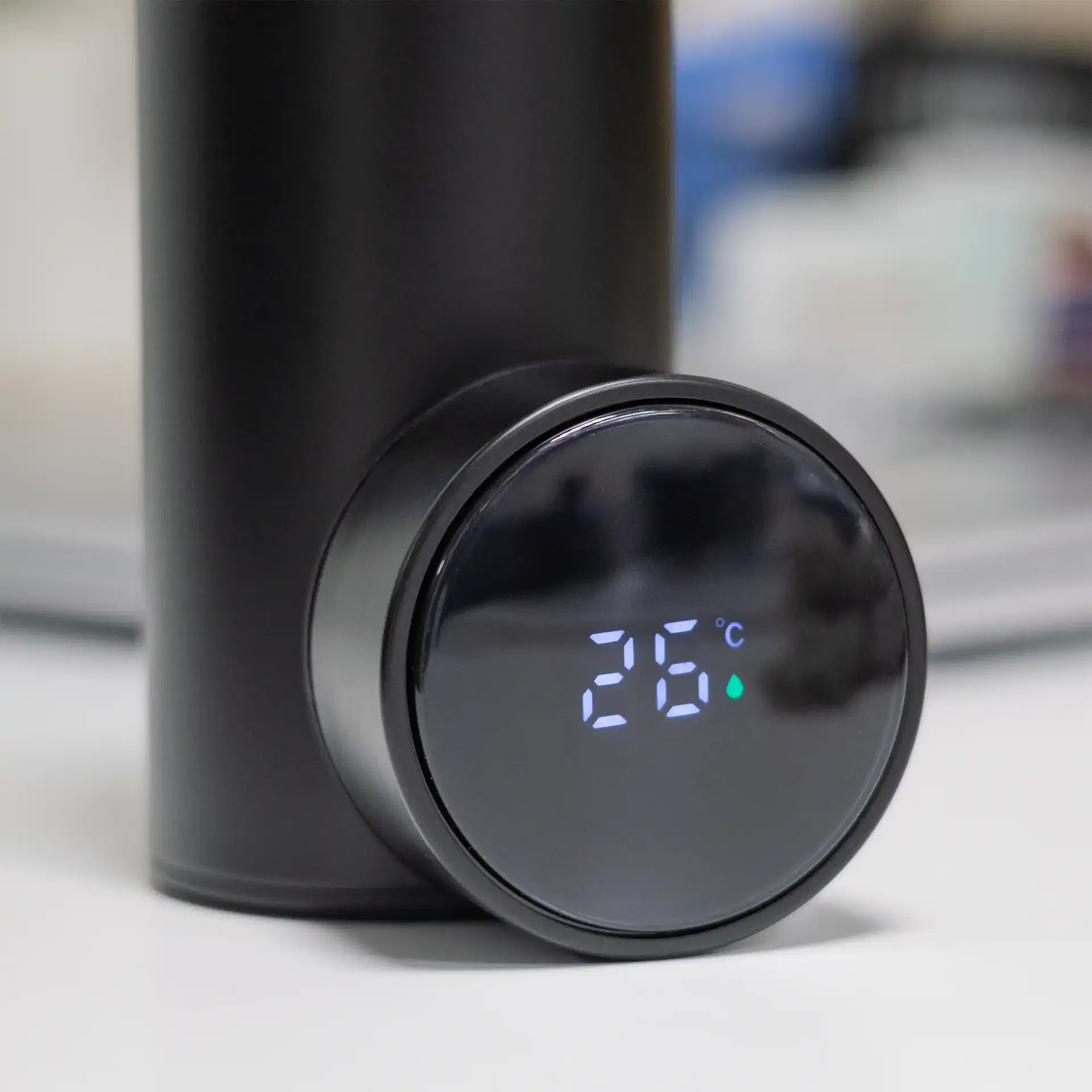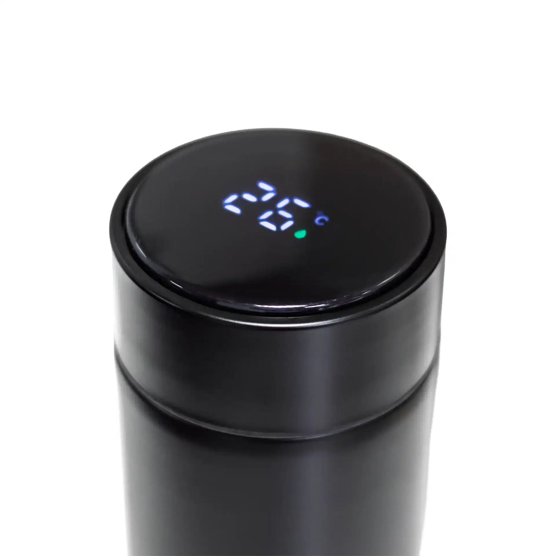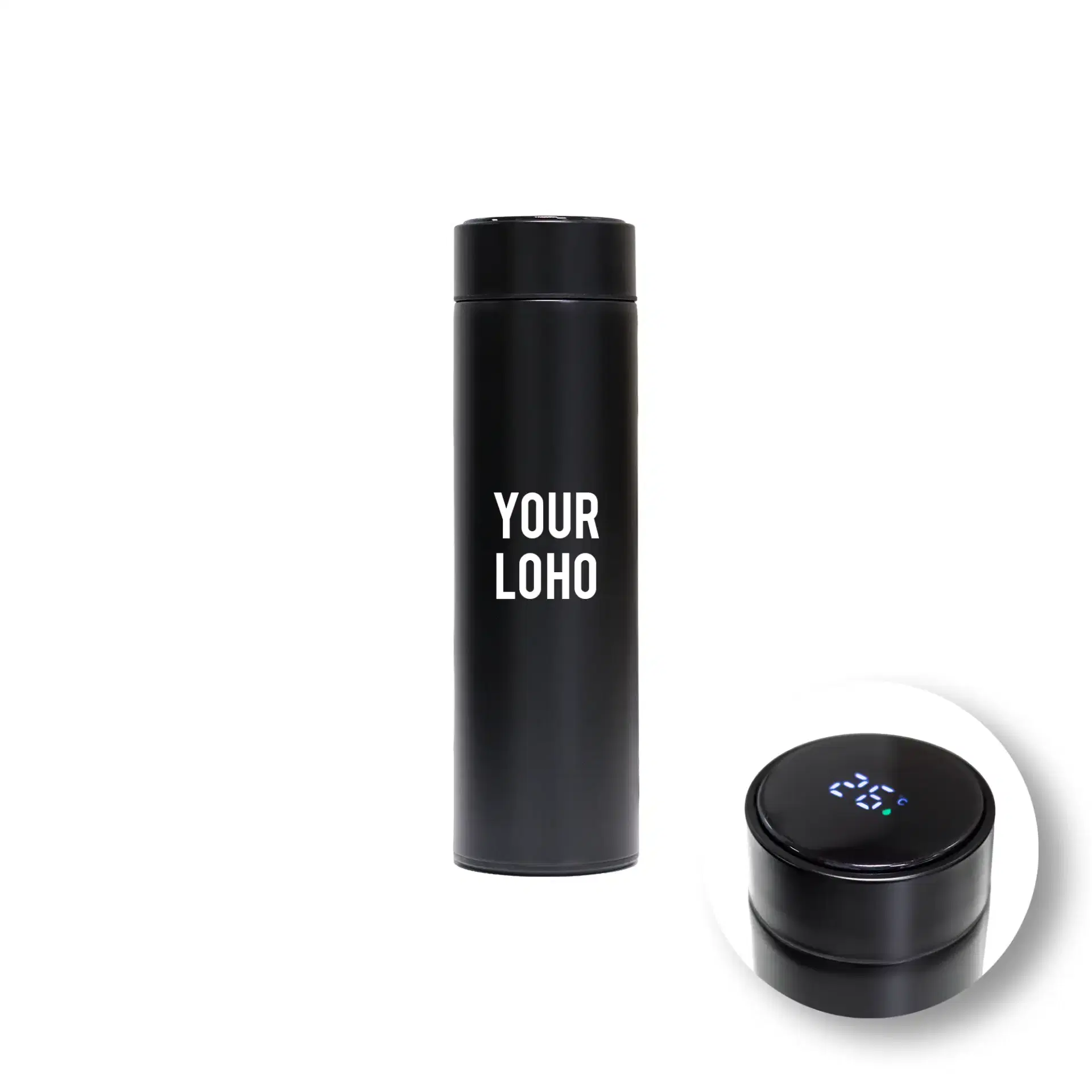 A premium stainless-steel insulated bottle with a smart LED temperature display on the lid. Designed in a clean white finish with double-wall insulation and a dedicated branding area for corporate logos.