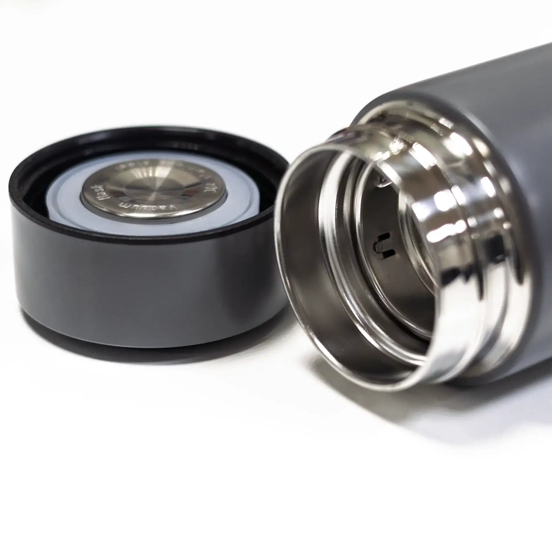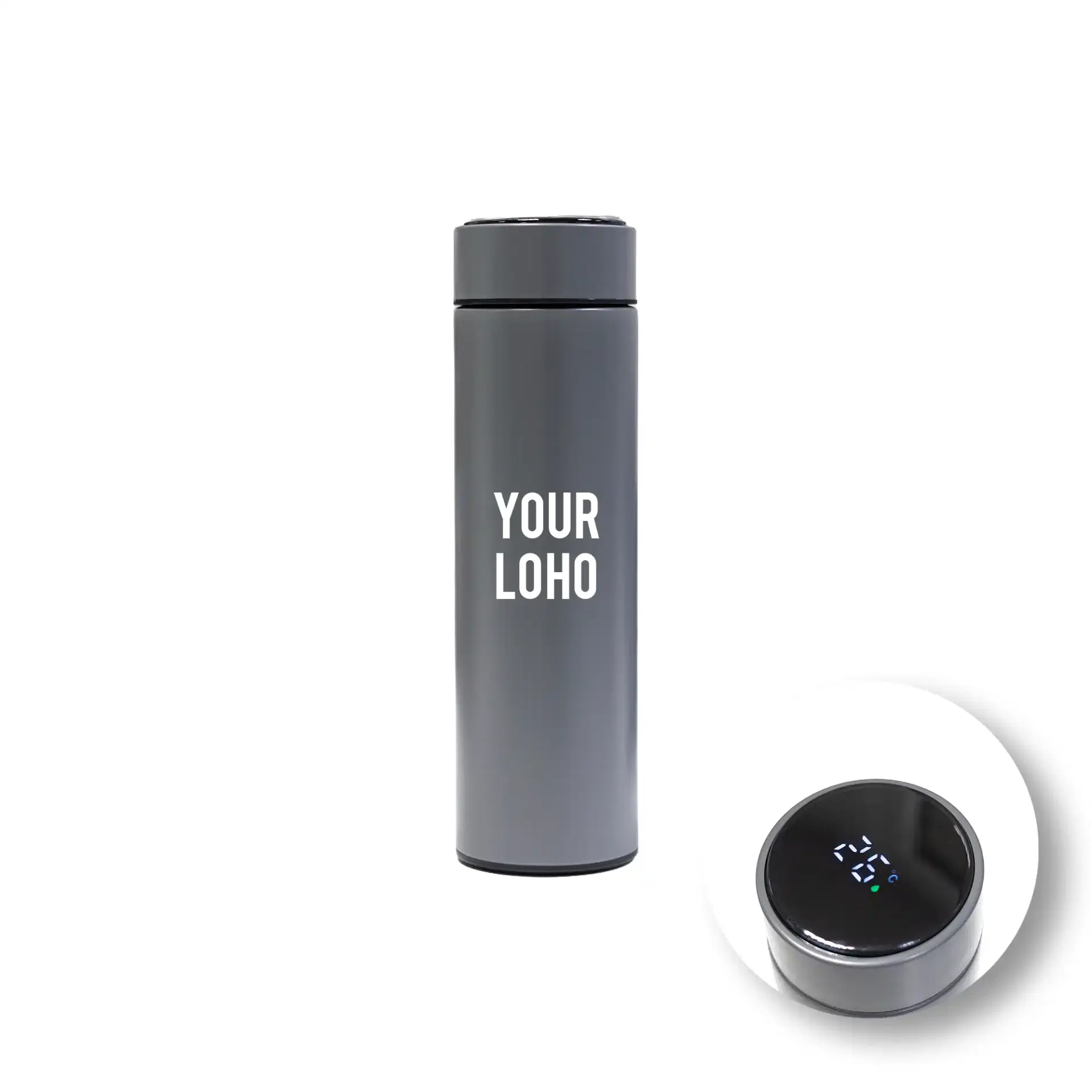 Smart insulated stainless steel bottle with touch LED temperature display on lid. Premium bulk corporate gift item suitable for promotions, giveaways, and large-scale branding projects.