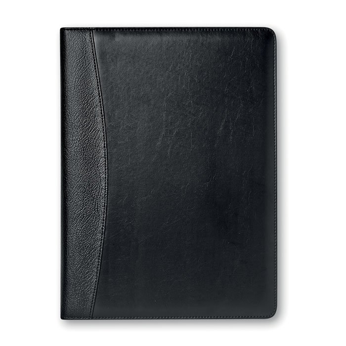 A4 faux leather portfolio. 20 lined sheets notepad. Solar powered calculator. Metal ball pen. Blue ink.