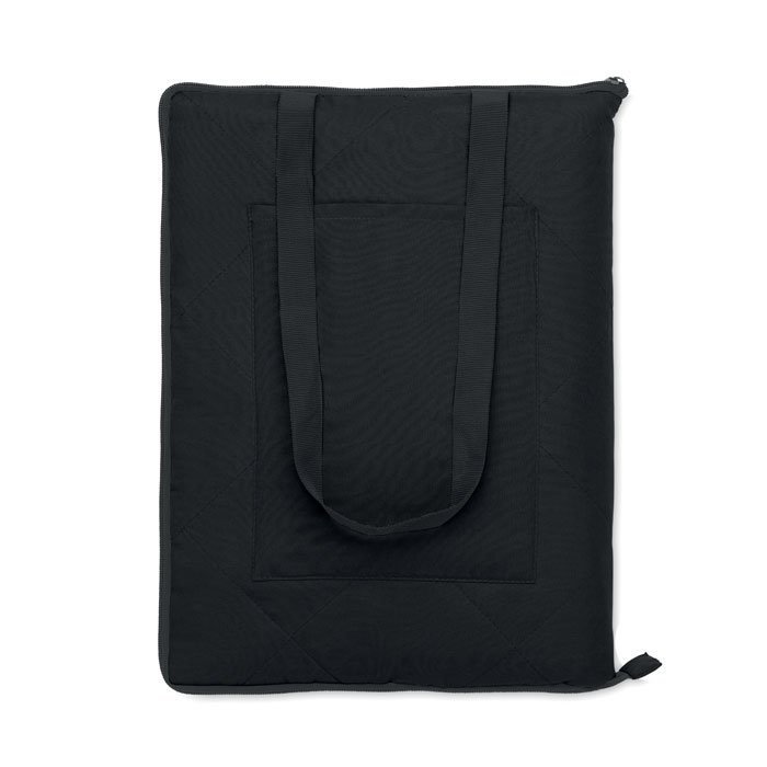 Foldable quilted picnic blanket with plastic coated PEVA on the reverse side. Folds into a convenient carry tote bag and has an adjustable shoulder strap. It includes a large front side pocket.