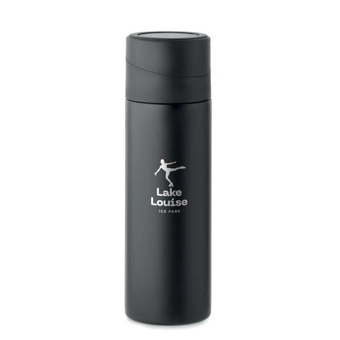 Double wall vacuum insulating bottle in recycled stainless steel (90% recycled stainless steel and 10% stainless steel) with silicone non-slip phone holder ring lid. Leak-free. Capacity: 420 ml.