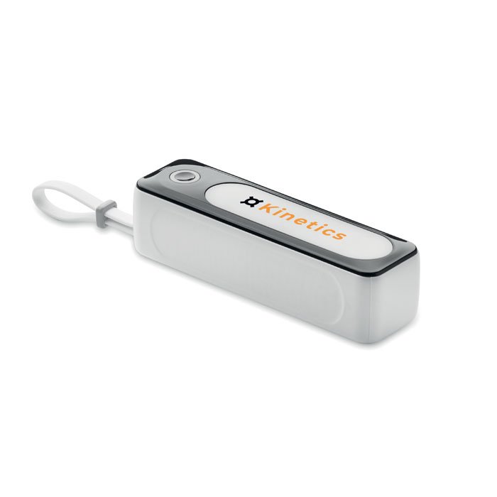Power bank 5000 mAh capacity in abs casing. Output current DC5V/2A 1x type A and 1x type C in/out. Includes indicating 4 light setting (6 COB led) and integrated USB cable with Type C plug output.