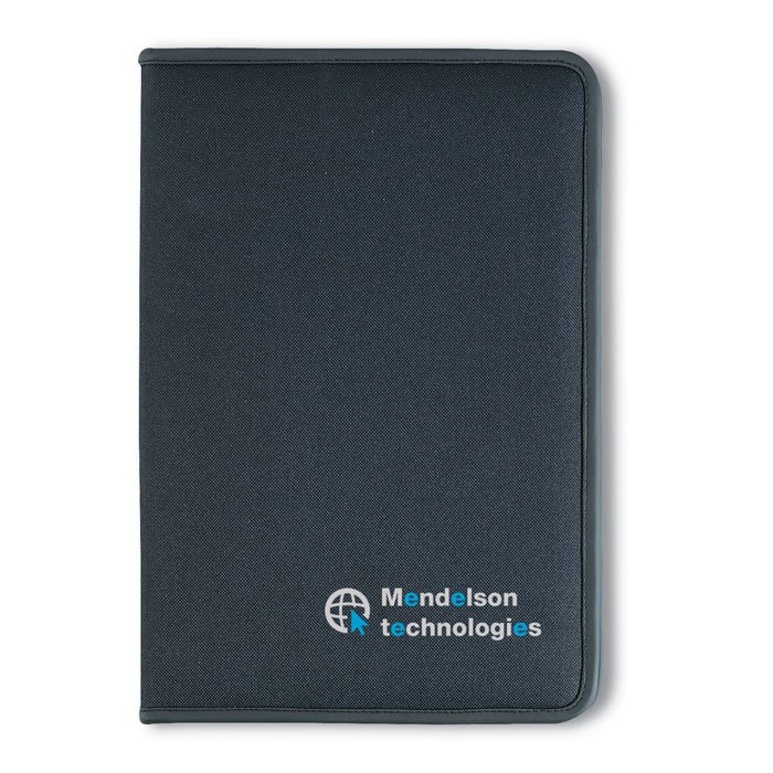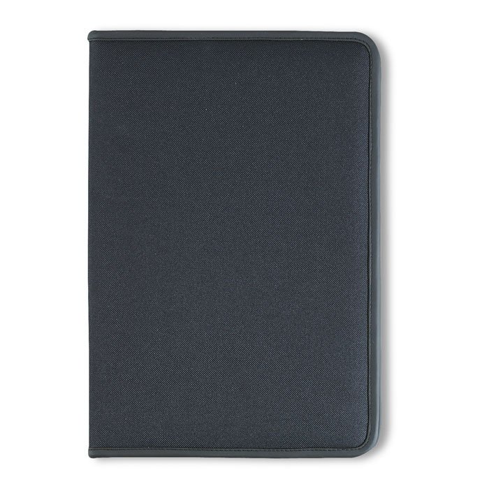 A4 conference folder. 600D polyester and 210T lining. Zipped. A4 20 lined recycled paper sheets notepad. 4 compartments. Card holer.