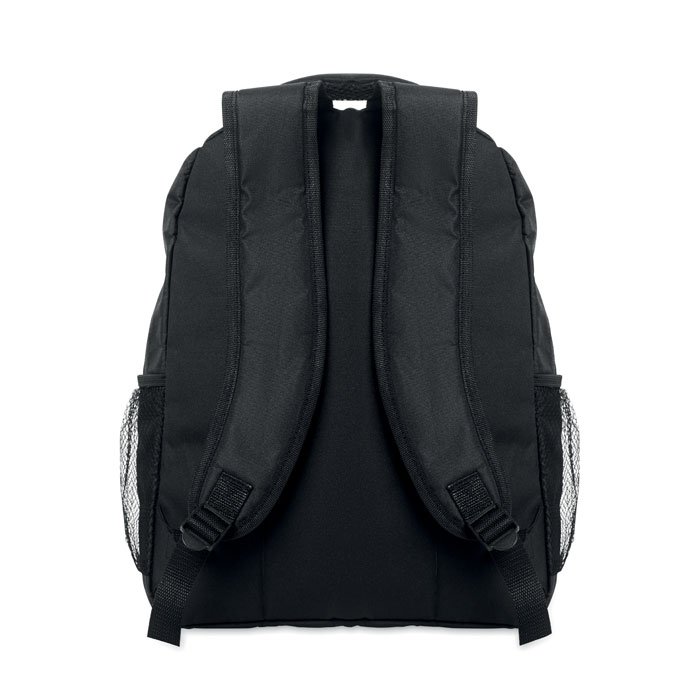 Laptop backpack 15inch in 600D RPET polyester with padded laptop compartment inside, mesh pockets on both sides and zippered front pocket.