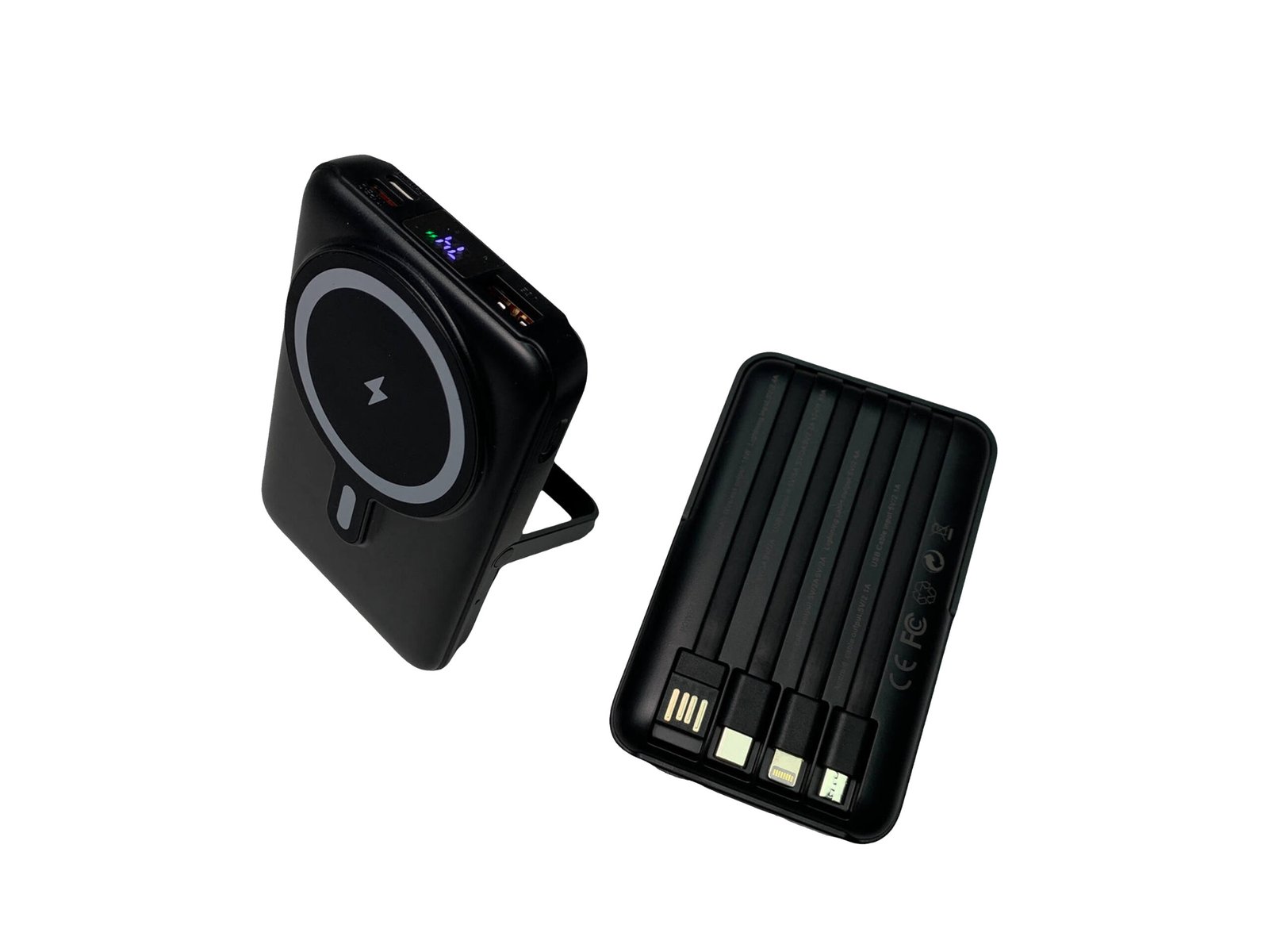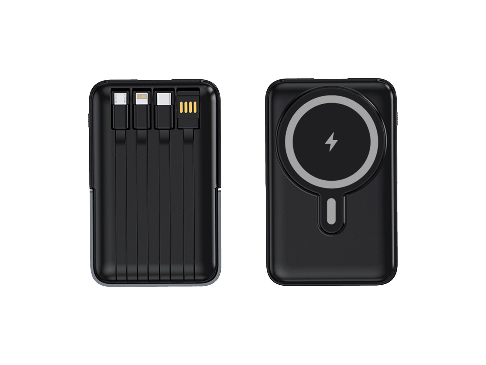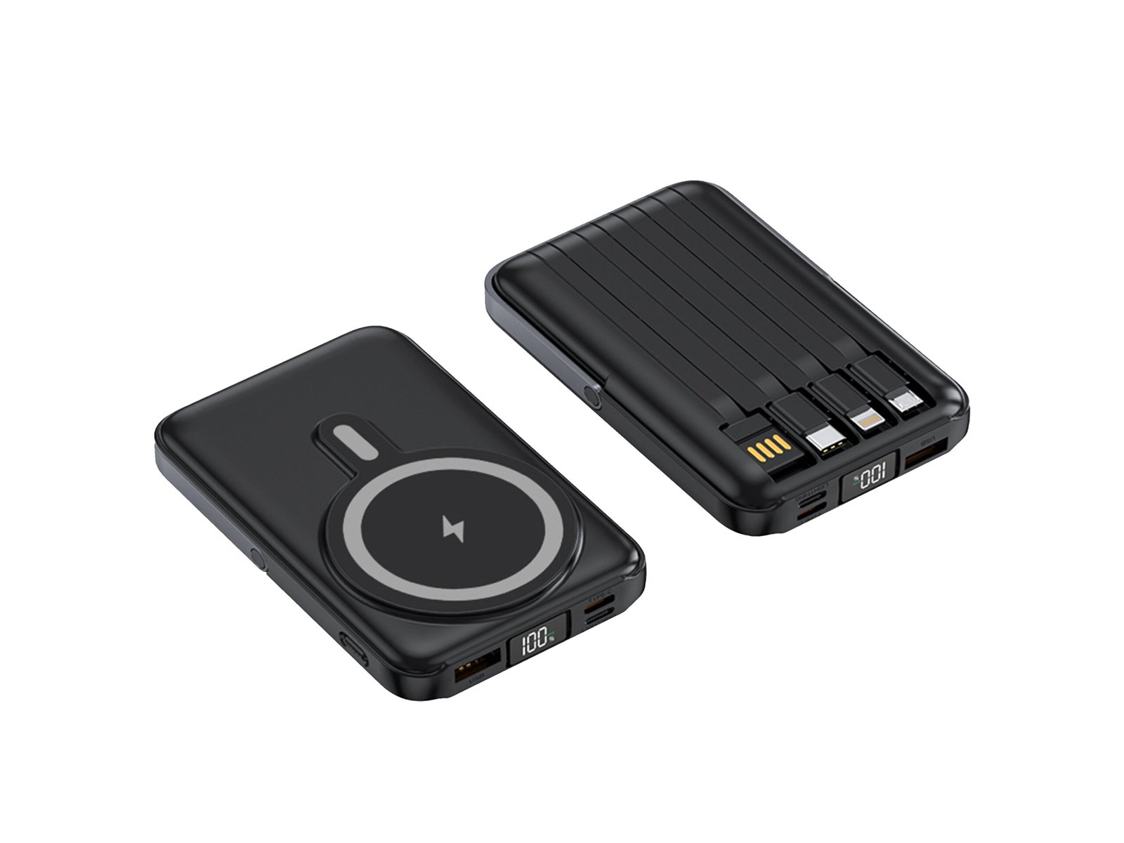 The Satraa 15W MagSafe Power Bank is an all-in-one charging solution designed for modern, multi-device lifestyles. Featuring a powerful 10,000mAh lithium polymer (Li-Po) battery, strong MagSafe magnetic wireless charging, and four built-in cables, this power bank eliminates the need to carry extra wires.