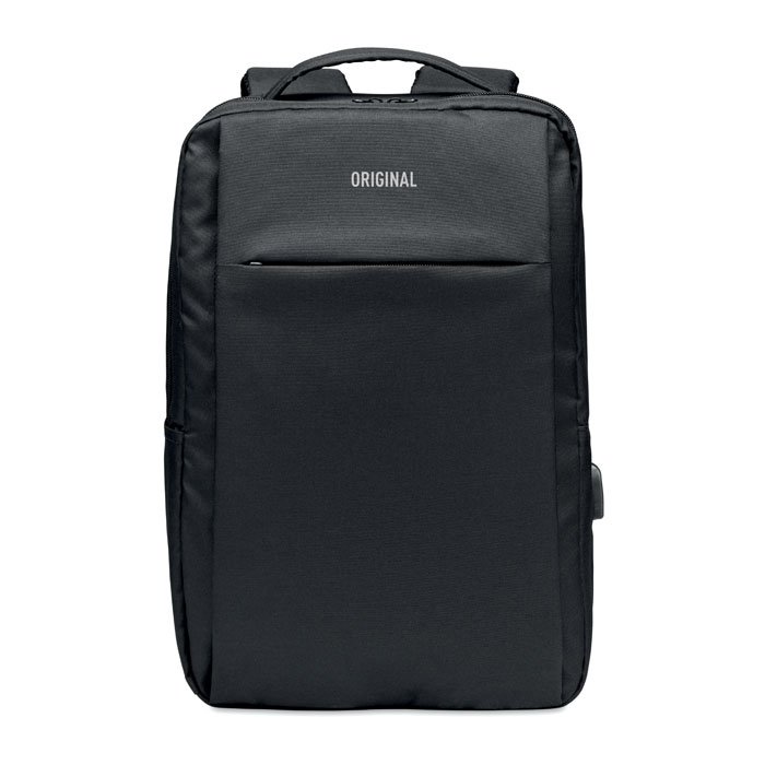 Laptop backpack in 300D RPET Polyester with padded shoulder strap including one main internal compartment for 16 inch laptop and a USB charging cable.