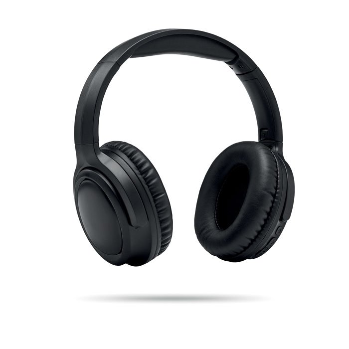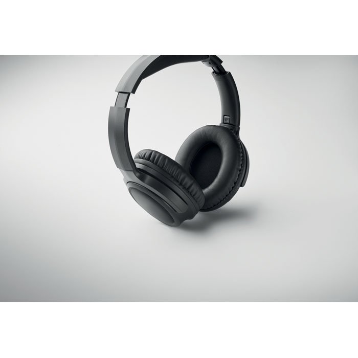 Active noise cancelling (ANC) 5.3 wireless foldable headphones in ABS. Hands free function and built-in microphone. Playing time approx. 17 hours. Includes Type-C charging cable. Rechargeable 200 mAh Li-ION battery. All presented in PU pouch. Operating range: 10 m.