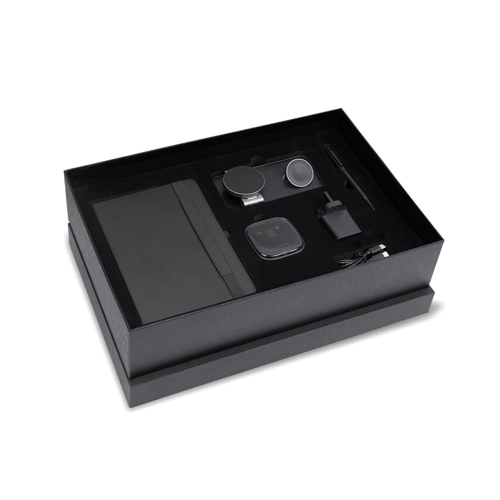 A premium desk and tech gift set combining everyday work essentials with smart charging accessories. The set includes a PU notebook, a 3-in-1 wireless charger, a power adapter, and charging cable, all neatly arranged in a premium gift box.