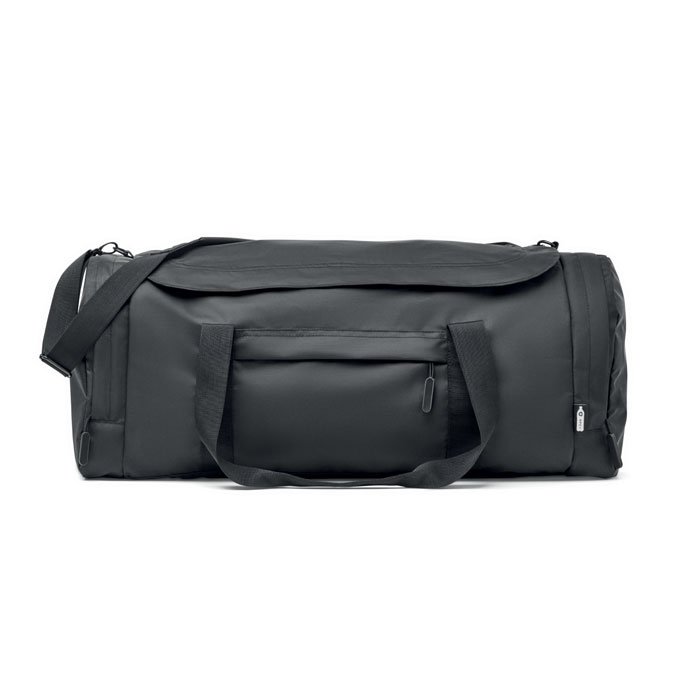 Large sports or travel bag in 300D RPET polyester. Main compartment with side zippered cooling and other compartments. Removable reinforcement bottom part and adjustable and detachable shoulder strap.