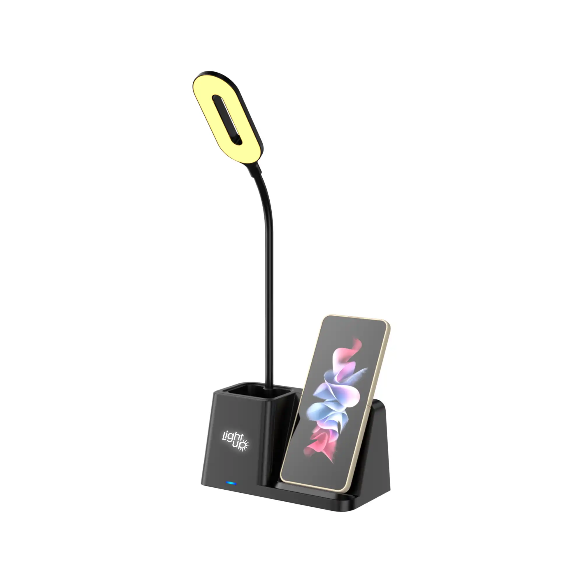 Stay organized and powered up with the 3-in-1 Wireless Charger. Combines a 15W fast wireless charger, LED desk lamp, and pen holder with a customizable light-up logo.